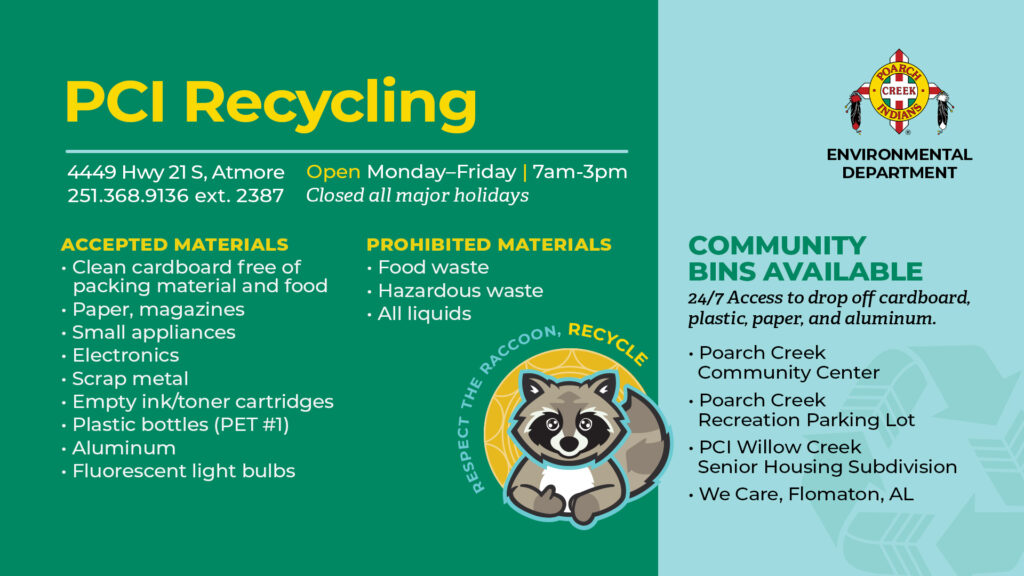 Atmore, Ala. – The Poarch Creek Indians are proud to offer expanded recycling opportunities to help protect our community, now and for future generations. Through the efforts of the Tribe’s Environmental Department, the Recycling Center and convenient community recycling drop-off bins are available to all Escambia County residents.